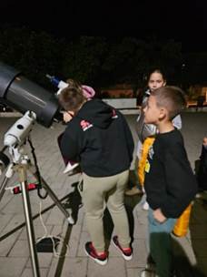 Gledajući kroz teleskop vidjeli smo: Mjesec, Saturn, zvijezde i zvježđa, duboki svemir… Pričalo se i odgovaralo na mnoga pitanja. Na naše veliko iznenađenje iz školskog dvorišta uspjeli smo uhvatiti komet C/2025. A 6 ( Lemmon). Zadivio nas je i očarao ovaj rijetki svemirski putnik. Dalibor nam je objasnio kako su kometi nepredvidljivi, ali Lemmon slijedi obrazac kakav astronomi priželjkuju -što je bliže Suncu to je sjajniji. Sunčeva toplina zagrijava zaleđenu površinu, led se pretvara u plin, a oslobođeni materijal stvara blještavu komu i rep koji reflektiraju svjetlost prema zemlji i našem teleskopu. Uspjeli smo vidjeti i drugi putnika kroz Sunčev sustav,komet C2025 R2 (Swan).